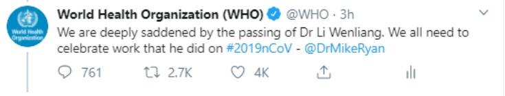 Τη λύπη του για τον θάνατο του γιατρού εξέφρασε με tweet και ο Παγκόσμιος Οργανισμός Υγείας