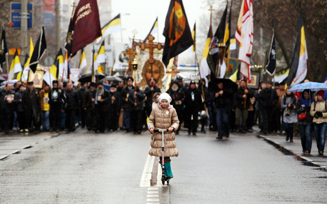Περί τους 3.000 εθνικιστές που ύψωναν σημαίες με τα χρώματα της αυτοκρατορικής Ρωσίας, μαύρο-κίτρινο-λευκό άρχισαν την πορεία τους σε δρόμο στις δύο πλευρές του οποίου είχαν τοποθετηθεί μεταλλικά φράγματα, ενώ η εξέλιξη της πορείας τελούσε υπό την στενή παρακολούθηση της αστυνομίας, όπως μεταδίδει το ΑΜΠΕ.