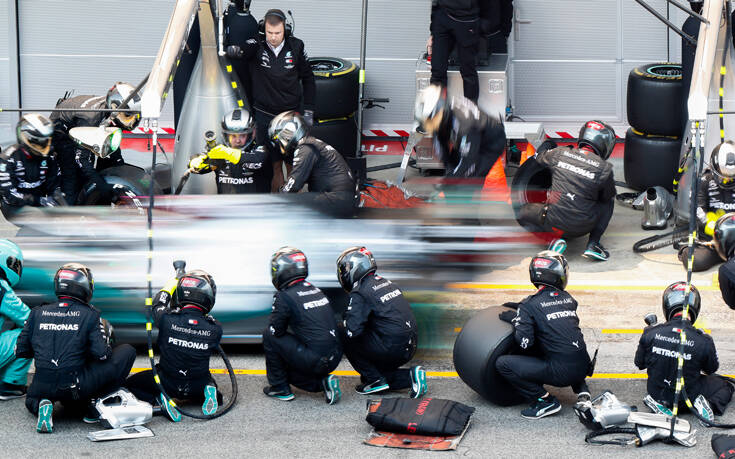 Ο τρόπος με τον οποίον λειτουργούν οι μηχανικοί των ομάδων της Formula 1 κατά τη διάρκεια ενός πιτ στοπ είναι εντυπωσιακός. Αυτή η ιδιαίτερη χορογραφία, που γίνεται πλέον σε λιγότερο από 3 δευτερόλεπτα, έγινε αρκετές φορές και στην πίστα της Βαρκελώνης, εκεί όπου το… τσίρκο της κορωνίδας του μηχανοκίνητου αθλητισμού ετοιμάζεται για τη νέα σεζόν, έστω και με λιγότερη πίεση σε σχέση με τους αγώνες. Στην εικόνα διακρίνονται οι άνθρωποι της Mercedes.
