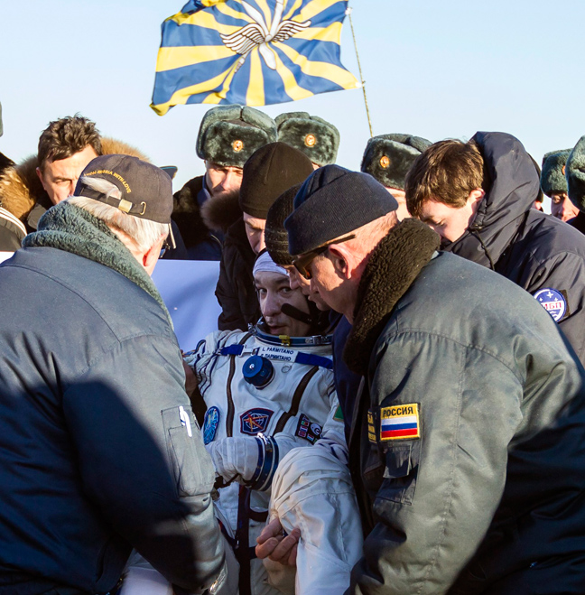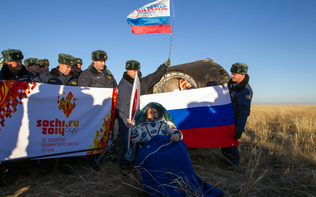 Στη συνέχεια την έδωσε στον διοικητή του Σογιούζ, το ρώσο κοσμοναύτη Φιοντόρ Γιουτσίχιν, που μόλις είχε βγει από το διαστημικό σκάφος. Λίγα λεπτά αργότερα βγήκαν από το Σογιούζ και οι δύο άλλοι αστροναύτες, ο Ιταλός Λούκας Παρμιτάνο και η Αμερικανίδα Κάρεν Νάιμπεργκ. Οι τρεις τους στάθηκαν δίπλα-δίπλα μπροστά από μια ρωσική σημαία και μια σημαία των Ολυμπιακών Αγώνων του Σότσι, που θα διεξαχθουν από τις 7 ως τις 23 Φεβρουαρίου 2014 ανάμεσα στα παράλια της Μαύρης Θάλασσας και τα βουνά του ρωσικού Καυκάσου.