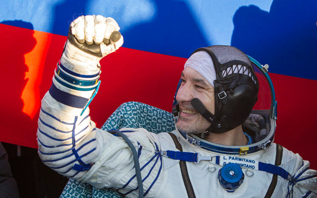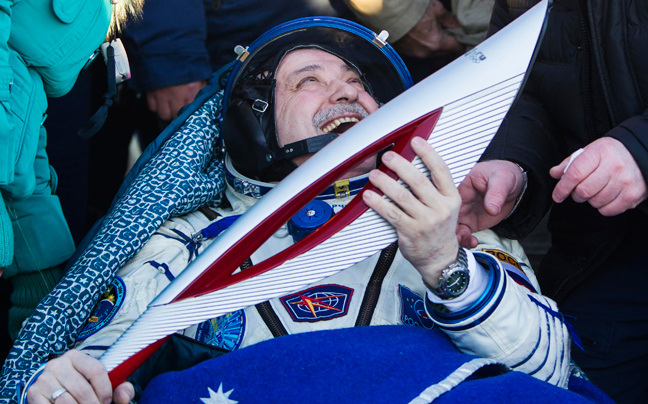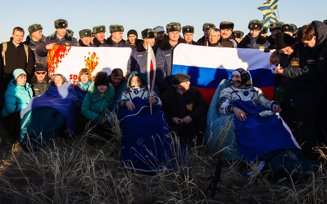 Κρεμασμένη από ένα μεγάλο λευκό αλεξίπτωτο, η κάψουλα Σογιούζ προσγειώθηκε στην περιοχή του Τζεζκαζγκάν, στις στέπες του Καζακστάν, όπως έδειξαν εικόνες που μεταδόθηκαν από τη ρωσική τηλεόραση.