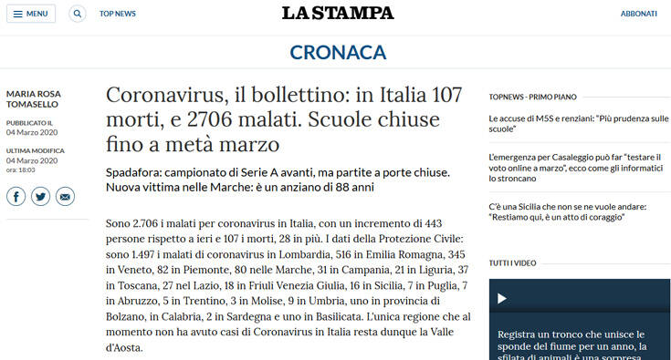 Αυξάνονται με ραγδαία ταχύτητα οι νεκροί από τον κορονοϊό στην Ιταλία. Σύμφωνα με τις τελευταίες πληροφορίες, τουλάχιστον 107 άνθρωποι έχασαν τη ζωή τους από τον φονικό ιό ενώ 2.706 ασθενείς παραμένουν στα νοσοκομεία.
