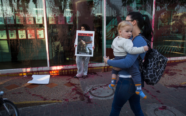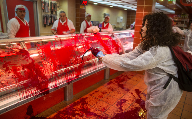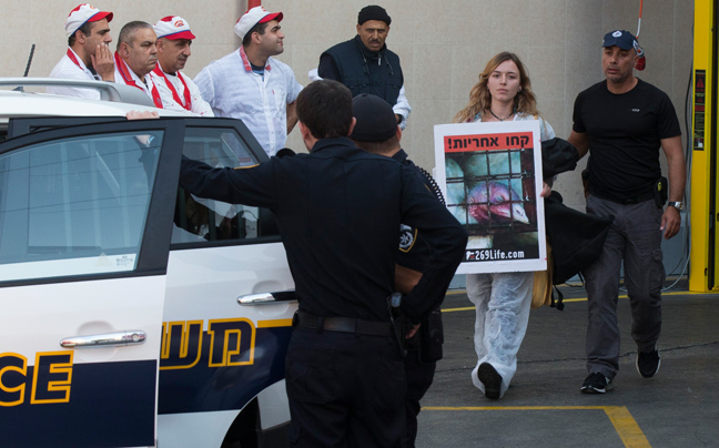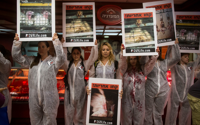 Σε μια πρωτότυπη διαμαρτυρία προέβησαν ισραηλινοί φιλόζωοι σε μια εταιρία που επεξεργάζεται κρέας στην πόλη Soglowek.