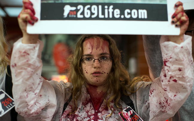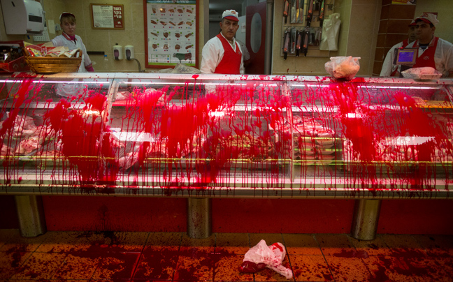Οι ακτιβιστές του κινήματος «269 Life» όπως ονομάζονται έριξαν ψεύτικο αίμα στα ψυγεία όπου εκτίθενται τα κρέατα, στις βιτρίνες και στο εσωτερικό της εταιρίας.