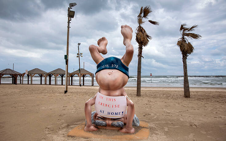 Εστιατόρια, εμπορικά κέντρα, ξενοδοχεία, καφέ, αθλητικές αίθουσες, ακόμη και παραλίες έκλεισε η κυβέρνηση του Ισραήλ, σε μία προσπάθεια να φρενάρει την εξάπλωση της επιδημίας του κορονοϊού. Ενδεικτική είναι η πινακίδα «Δοκιμάστε αυτήν την άσκηση στο σπίτι», στο Τελ Αβίβ, λίγα μέτρα πριν τη θάλασσα.
