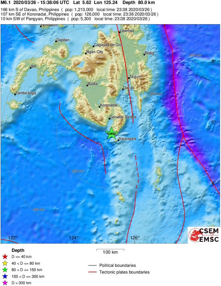 Η δόνηση είχε εστιακό βάθος 80 χιλιόμετρα και το επίκεντρό του εντοπίζεται στα 166 χιλιόμετρα νότια του Νταβάο.