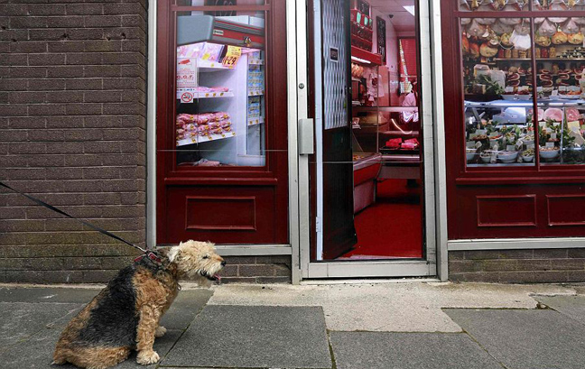 Άντρας περνά με τον σκύλο του στις 3 Ιουνίου έξω από αδειανό μαγαζί της Βόρειας Ιρλανδίας, που έχει ντυθεί με πόστερ για να μοιάζει με χασάπικο. Οι δημοτικές Αρχές της Βόρειας Ιρλανδίας έντυσαν κλειστά μαγαζιά και εγκαταλειμμένα κτίρια με γιγαντοαφίσες και φωτογραφίες για να κρύψουν την οικονομική κρίση που μαστίζει τη χώρα στα χωριά και τις πόλεις που βρίσκονταν κοντά στο θέρετρο όπου διοργανώθηκε η σύνοδος των G8 τον Ιούνιο…