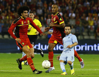 Ο Γάλλος Mathieu Valbuena (δεξιά) μαρκάρεται από τους Βέλγους Marouane Fellaini και Vincent Kompany κατά τη διάρκεια του διεθνούς φιλικού στο στάδιο King Baudouin των Βρυξελλών στις 14 Αυγούστου…