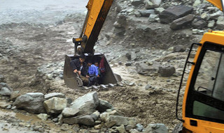 Εκσκαφέας χρησιμοποιείται δημιουργικά για να απομακρύνει τους εγκλωβισμένους χωριανούς από την πλημμυρισμένη περιοχή Yingxiu της επαρχίας Sichuan, κατά τη διάρκεια των πρωτόγνωρων βροχοπτώσεων που γνώρισε ο τόπος στις 10 Ιουλίου.