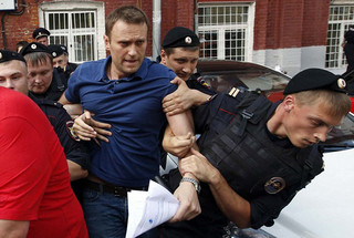 Αστυνομικοί συλλαμβάνουν τον ηγέτη της αντιπολίτευσης και ακτιβιστή Alexei Navalny αφότου επισκέφτηκε το δημαρχιακό μέγαρο για να καταθέσει την υποψηφιότητά του για τη δημαρχία της Μόσχας στις 10 Ιουλίου…