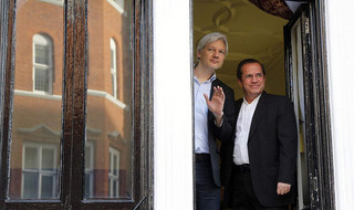 Ο ιδρυτής των WikiLeaks, Τζούλιαν Ασάνζ, χαιρετά δίπλα στον υπουργό Εξωτερικών του Ισημερινού, Ricardo Patino, μέσα από την πρεσβεία του Ισημερινού στο Κεντρικό Λονδίνο: 16