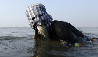Ο 39χρονος ψαράς Ompong Vargas, φορώντας καλύπτρα κεφαλής για να προστατεύσει το δέρμα του από τον καυτό ήλιο, κρατά το ψάρι στο στόμα του καθώς ψάχνει με τα χέρια του να βρει το δίχτυ: Laguna de Bay, πόλη Taguig, Φιλιππίνες, 24 Μαΐου.