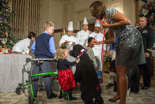 Οικογένειες στρατιωτικών υποδέχθηκε χθες στο Λευκό Οίκο η Πρώτη Κυρία των ΗΠΑ Μισέλ Ομπάμα, «εγκαινιάζοντας» τη φετινή εορταστική περίοδο. Τους καλεσμένους περίμεναν χριστουγεννιάτικη ατμόσφαιρα, ζεστός μηλίτης, κουλουράκια, ένα ομοίωμα του Λευκού Οίκου φτιαγμένο από μπισκότο και ένα… πολύ φιλικό κατοικίδιο!