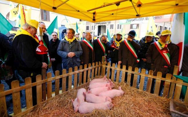 Δεκάδες γουρούνια, αλλά και χοιρινά προϊόντα, βρέθηκαν σήμερα έξω από το ιταλικό κοινοβούλιο, σε μια πρωτότυπη διαμαρτυρία των κτηνοτρόφων που αντιδρούν στην παράνομη πώληση προϊόντων που «βαπτίζονται» ιταλικά στην αγορά της χώρας.