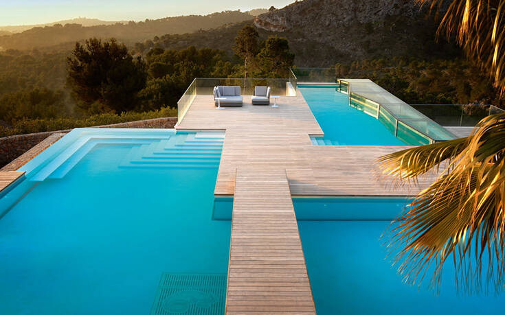 Καλυμμένη με ξύλο τικ, η ταράτσα λειτουργεί και ως ελικοδρόμιο. Αλλά και ως παρατηρητήριο για την απίθανη θέα, που τη χαίρεσαι ακόμα και μέσα από την πισίνα.