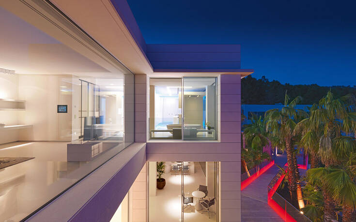Επιβλέποντας τη θάλασσα και το λιμάνι και καλυμμένη με κρύσταλλο, η πρόσοψη είναι γεμάτη LED φώτα, ώστε να αλλάζει το χρώμα σύμφωνα με τις διαθέσεις των ενοίκων.