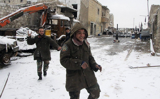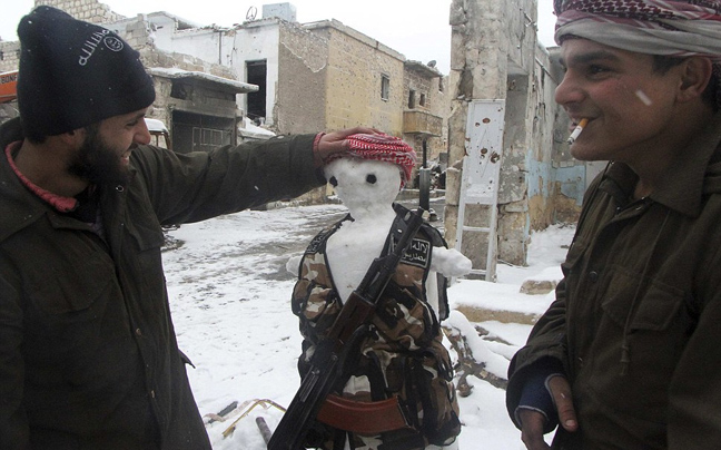 Προφανώς δεν λύνει κανένα από τα σημαντικά προβλήματα που μαστίζουν την αιματοβαμμένη Συρία, αλλά το χιόνι που έντυσε τη χώρα στα λευκά επέτρεψε μερικές στιγμές ανεμελιάς μέσα στον πόλεμο- ακόμα και αν ο χιονάνθρωπος κρατά όπλο.