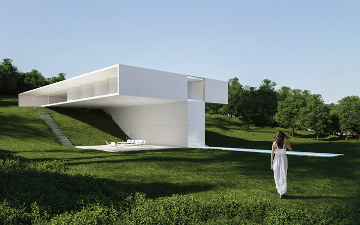 Το επάνω επίπεδο του σπιτιού βρίσκεται κυριολεκτικά στον αέρα, βάζοντας λες τα γυαλιά στα καπρίτσια του λοφίσκου.