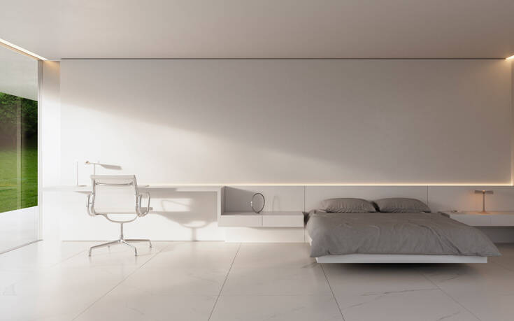Οι κυρίως χώροι διαβίωσης στεγάζονται στο μεγάλο ορθογώνιο κτίσμα, θέτοντας στο κέντρο τα υπνοδωμάτια και τους κοινόχρηστους χώρους στην περίμετρο.