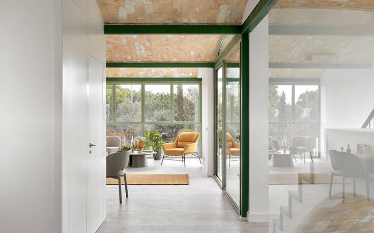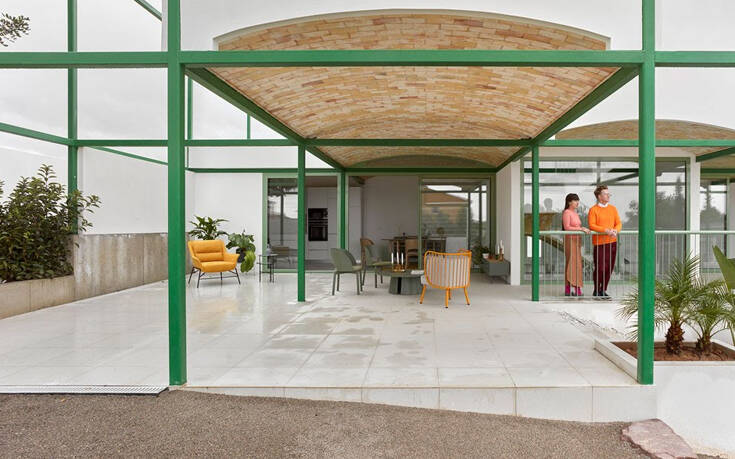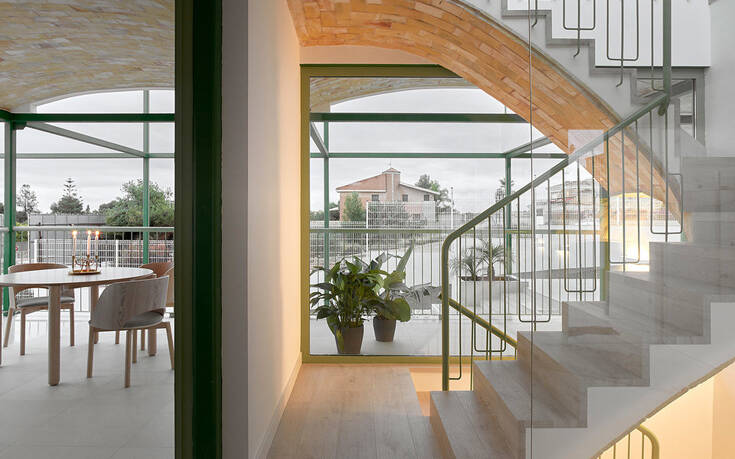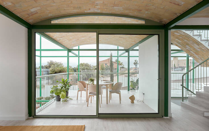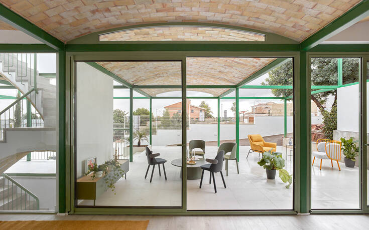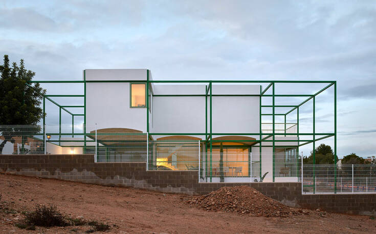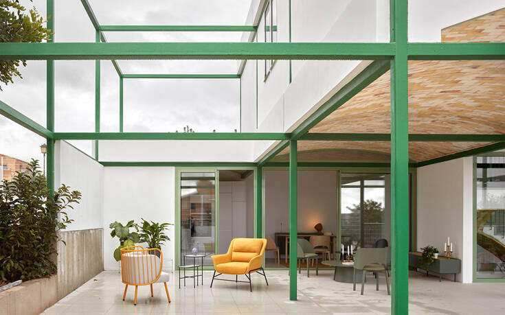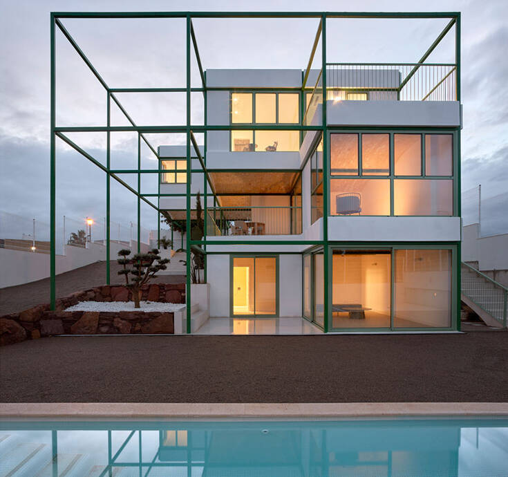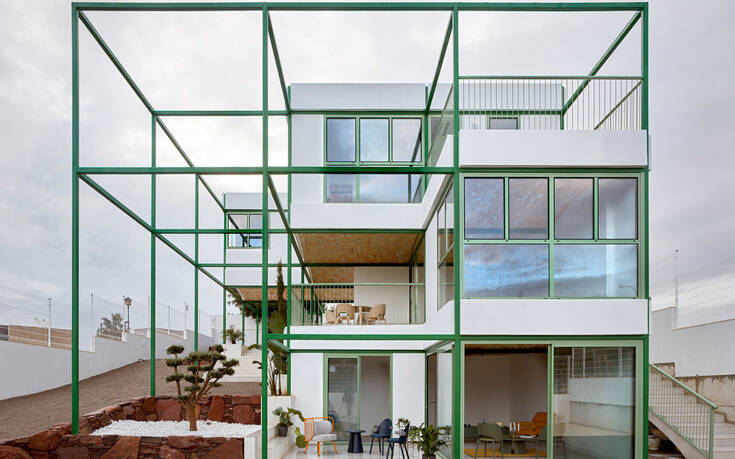 Η τριώροφη μονοκατοικία της Βαλένθια, που χτίστηκε το 2019 πάνω σε μια πλαγιά, καθορίζεται από αυτό το πράσινο χαλύβδινο πλαίσιο.