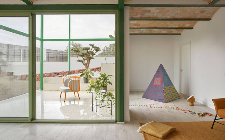 Το παιχνιδιάρικο της κατασκευής δεν σταματά όμως στο εξωτερικό. Την ώρα δηλαδή που η πρόσοψη αποτελείται από καθαρές γραμμές και γεωμετρικά μοτίβα, η αισθητική στο εσωτερικό ακολουθεί διαφορετικά μονοπάτια.