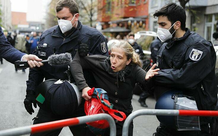 Αστυνομικοί, φορώντας μάσκες, συγκρούστηκαν το Σάββατο με δεκάδες διαδηλωτές που συγκεντρώθηκαν στο κέντρο του Βερολίνου για να διαμαρτυρηθούν για την καταπάτηση των συνταγματικών δικαιωμάτων τους εν μέσω της πανδημίας.