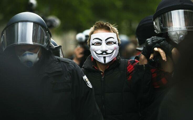Ορισμένοι από τους διαδηλωτές προσπαθούσαν να τηρήσουν τις αποστάσεις και φορούσαν μάσκες, όμως άλλοι είχαν συγκεντρωθεί όλοι μαζί. Μοίραζαν εφημερίδες με τον τίτλο «Δημοκρατική Αντίσταση», που ανέφεραν ότι ο νέος κορονοϊός είναι μια προσπάθεια κάποιων να αρπάξουν την εξουσία διασπείροντας τον φόβο. Τα έντυπα αυτά παρέθεταν δηλώσεις 127 γιατρών απ’ όλον τον κόσμο οι οποίοι αμφισβητούσαν την ανάγκη για λήψη αυστηρών μέτρων περιορισμού.