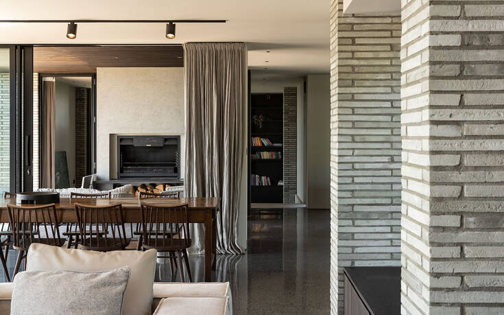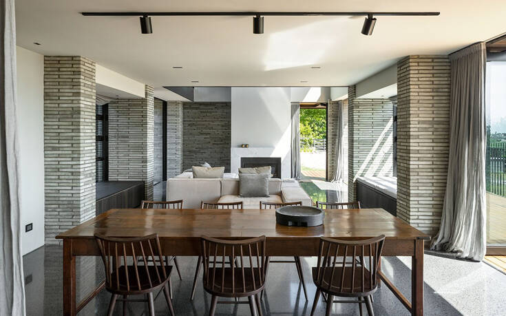 Κι ενώ τη θέα τη χαίρονται οι ένοικοι από τον πάνω όροφο, είναι στο ισόγειο και τους κοινόχρηστους χώρους που ανοίγεται το σπίτι στη φύση, μπλέκοντας ουσιαστικά τα όρια ανάμεσα στο μέσα και το έξω…