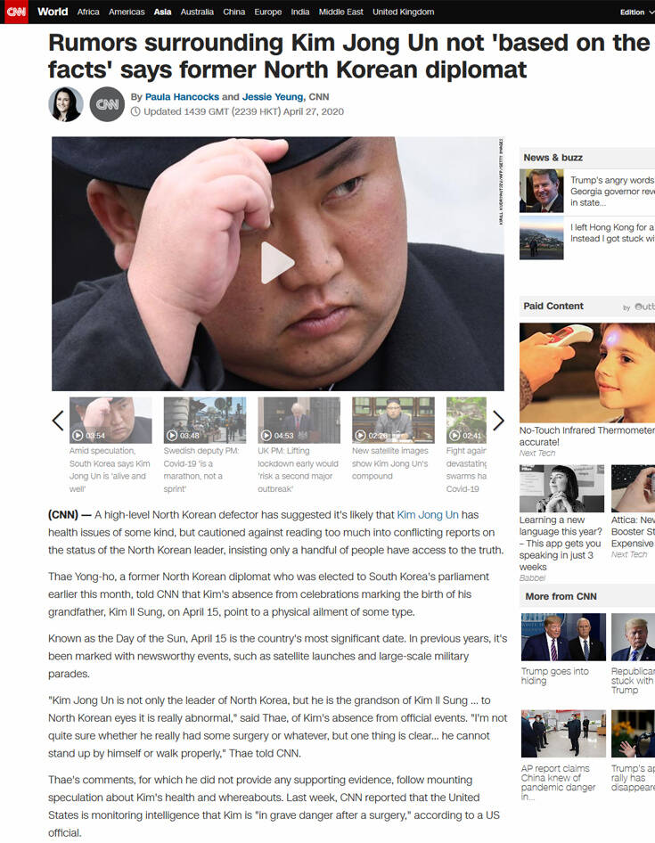 «Οι μόνοι άνθρωποι που μπορούν να επιβεβαιώσουν την κατάσταση στην οποία βρίσκεται είναι η σύζυγός του ή η αδελφή του, ή οι στενοί συνεργάτες του» λέει ο Thae. «Οι φήμες για το πού βρίσκεται ή το εάν υποβλήθηκε σε επέμβαση, δεν νομίζω πως βασίζονται σε γεγονότα».