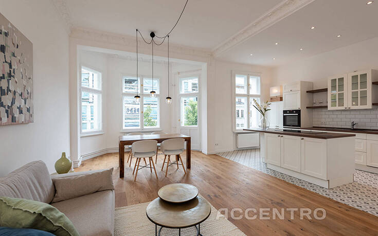 Παρκέ στα πατώματα, άπλετο ηλιακό φως και μοντέρνα αισθητική που αποφεύγει τις υπερβολές, στο χαρακτηριστικά χαλαρό βερολινέζικο στιλ.