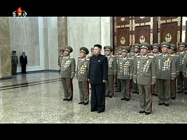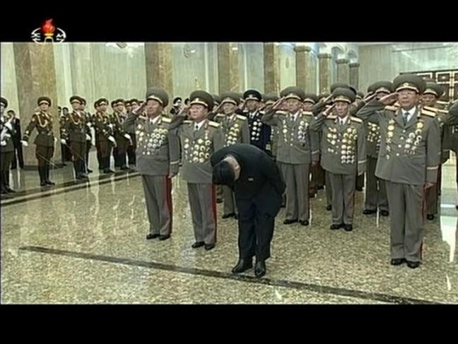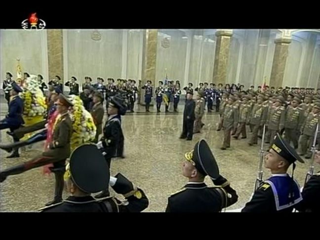 Η τηλεόραση της χώρας μετέδωσε εικόνες στις οποίες εμφανίζεται ο βορειοκορεάτης ηγέτης μπροστά από τα γιγιανταία αγάλματα των δυο προκατόχων του, συνοδευόμενος από δεκάδες ανώτερους στρατιωτικούς.