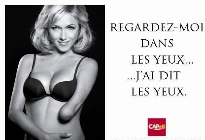 Η 35χρονη γραφίστρια Tanja Kiewitz που έχει γεννηθεί χωρίς χέρι δέχτηκε αμέσως την πρόταση της MKO να ποζάρει μόνο με τα εσώρουχά της και να κοιτάζει στα μάτια την κάμερα. Το σλόγκαν της καμπάνιας που αναγράφεται δίπλα στην ημίγυμνη φωτογραφία της καλλονής είναι «Κοίταξε με στα μάτια…..στα μάτια είπα».