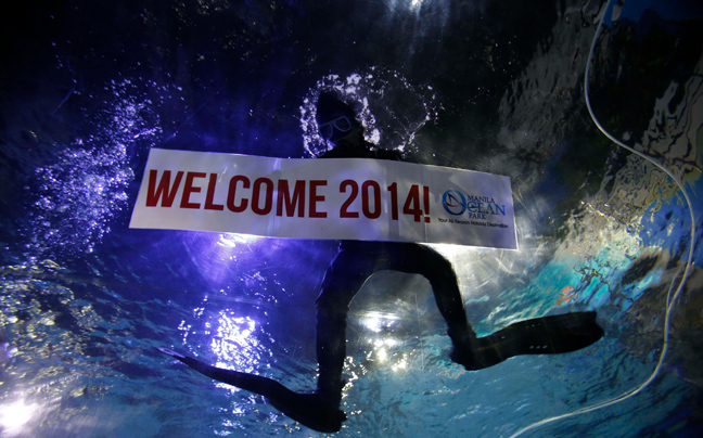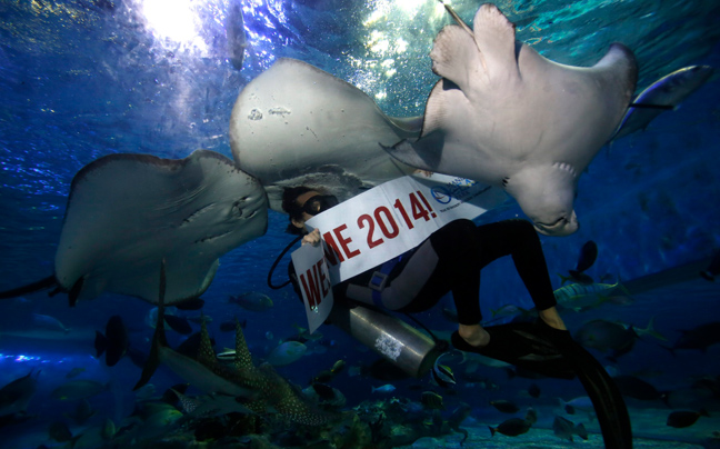 Επαγγελματίας δύτης κρατά ένα πανό μου γράφει «Καλωσόρισες 2014» ενώ κολυμπά δίπλα σε σαλάχια, κατά τη διάρκεια των εορτασμών για την αλλαγή του χρόνου σε θαλάσσιο πάρκο της Μανίλα, στις Φιλιππίνες.