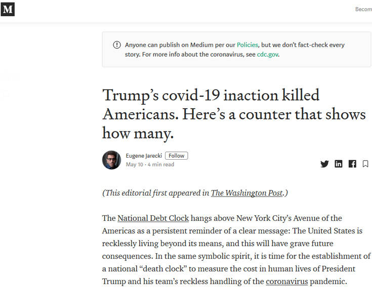 Ο μετρητής αυτός βασίζεται στην εξής υπόθεση: το 60% των θανάτων από Covid-19 στις ΗΠΑ θα μπορούσε να είχε αποφευχθεί εάν η κυβέρνηση του Ντόναλντ Τραμπ είχε αποφασίσει να εφαρμόσει τους κανόνες κοινωνικής αποστασιοποίησης, το κλείσιμο των σχολείων και επιχειρήσεων περίπου μία εβδομάδα νωρίτερα από ό,τι το έπραξε, δηλαδή την 9η Μαρτίου αντί της 16ης, εξήγησε ο Τζαρέκι στο μπλογκ του στο Medium.