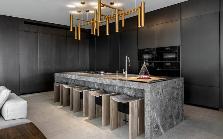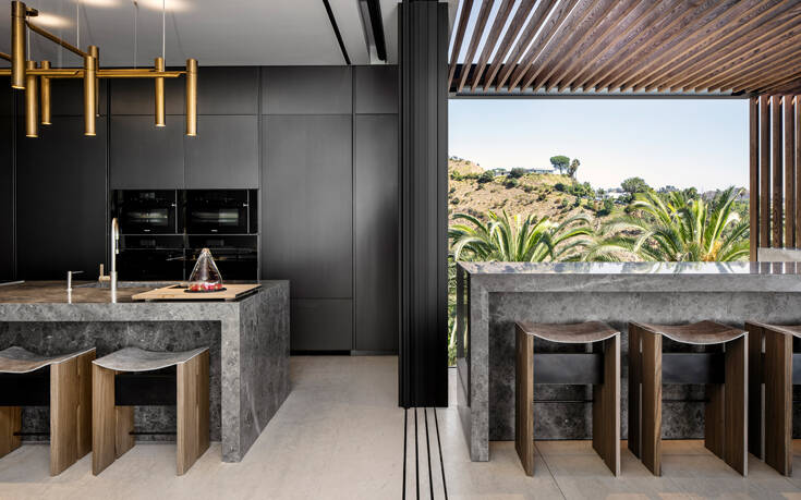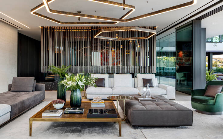 Ενιαίοι χώροι, στιλπνές επιφάνειες και η δέουσα δραματικότητα επιβάλουν το δέος, την ίδια ώρα που η αρχιτεκτονική φιλοσοφία συνέλαβε το σπίτι ως μια σειρά διασυνδεδεμένων δωματίων σε άμεση επαφή με το εξωτερικό.