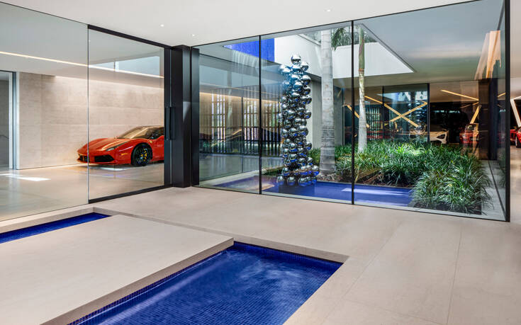 Το νερό περνά και στο εσωτερικό της οικίας, φτάνοντας ακόμα ως και το ανοιχτό γκαράζ, ώστε να είναι ανά πάσα στιγμή ο ιδιοκτήτης σε επαφή με τα 12 supercars του.