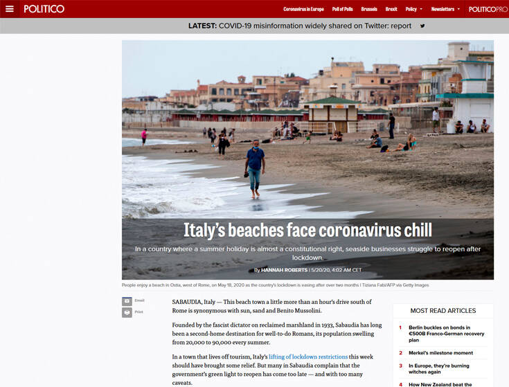 Έπειτα από δέκα εβδομάδες περιορισμών, λόγω του κορονοϊού, καταστήματα, εστιατόρια, μπαρ και beach club στην Ιταλία άνοιξαν ξανά τη Δευτέρα. Αλλά σε παραλιακές πόλεις, όπως η Sabaudia, η επιστροφή «στην κανονικότητα» υπήρξε εντυπωσιακά χαοτική, με επιμέρους περιοχές να καθορίζουν μόνες τους πώς θα γίνει ασφαλής διαχείριση των δημόσιων παραλιών.