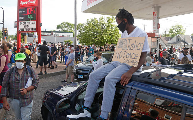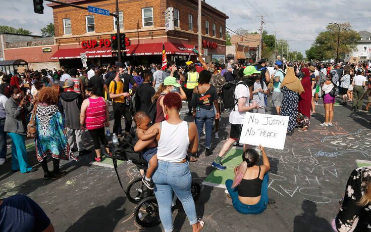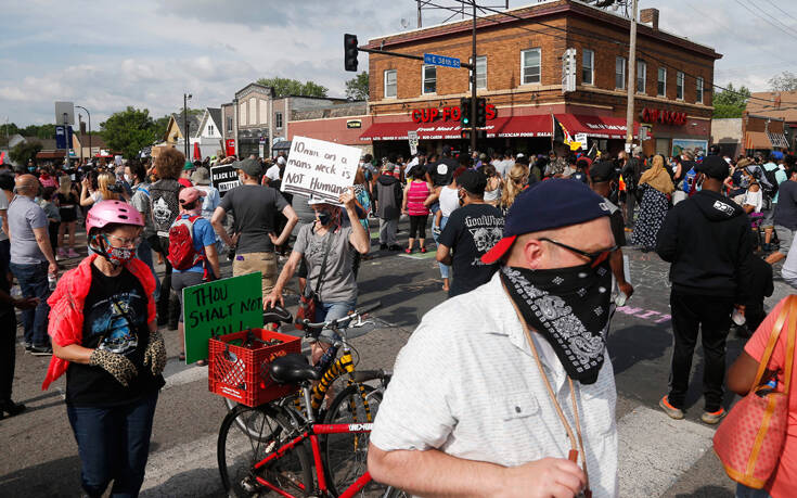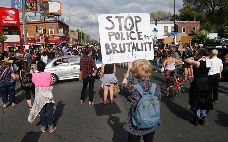 Λίγες ώρες μετά την αποπομπή των αστυνομικών, χιλιάδες διαδηλωτές γέμισαν τους δρόμους γύρω από το σημείο που εκτυλίχθηκε η τραγωδία τη Δευτέρα το βράδυ, με πολλούς διαδηλωτές να φορούν μάσκα λόγω της επιδημίας του κορονοϊού.