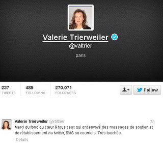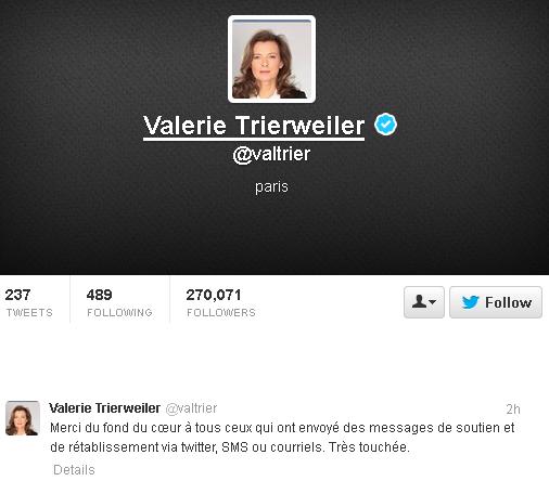 Η επίσημη σύντροφος του προέδρου της Γαλλίας Βαλερί Τριερβελέρ ευχαρίστησε σήμερα όσους την στήριξαν τις τελευταίες ημέρες, στο διάστημα που νοσηλευόταν με νευρικό κλονισμό μετά την αποκάλυψη ότι ο Φρανσουά Ολάντ διατηρούσε δεσμό με την ηθοποιό Ζουλί Γκαγιέ.