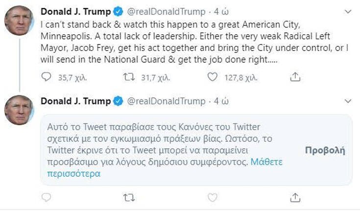 To Twitter τοποθέτησε μήνυμα αποδοκιμασίας κάτω από tweet του Ντόναλντ Τραμπ σχετικά με τα επεισόδια στην Μινεάπολις για «εκθείαση βίας».