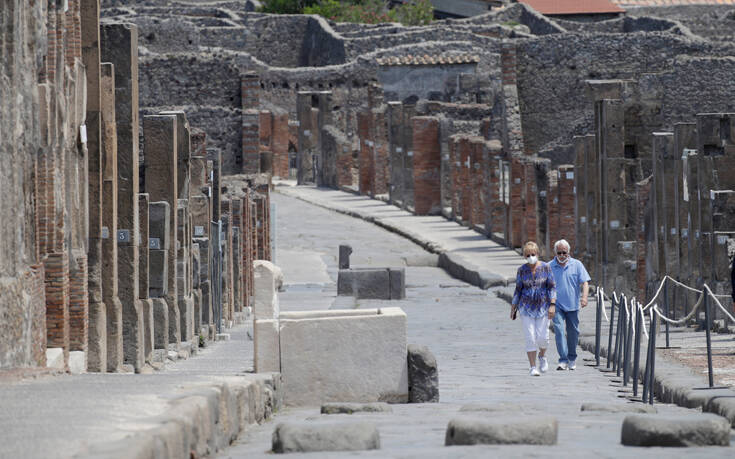Ένα ζευγάρι από τις ΗΠΑ περπατά στους δρόμους της Πομπηίας, σε ένα αισιόδοξο μήνυμα για την Ιταλία, καθώς ήταν μια από τις χώρες που ταλαιπωρήθηκε όσο λίγες από την πανδημία του κορονοϊού. Η χώρα προσπαθεί να επιστρέψει στην κανονικότητα, έχοντας ωστόσο και πάνω από 33.000 νεκρούς, για τους οποίους ακόμη θρηνεί.