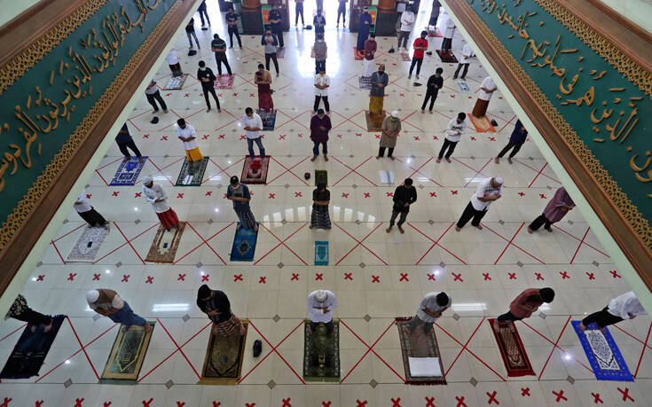 Μουσουλμάνοι προσεύχονται στο τζαμί Αλ Μπαρκάχ, στα περίχωρα της Τζακάρτα, παίρνοντας τις απαραίτητες αποστάσεις μεταξύ τους λόγω κορονοϊού. Οι τόποι προσευχής άνοιξαν ξανά στην Ινδονησία, μετά από καιρό, λόγω των περιοριστικών μέτρων για αποτροπή εξάπλωσης της πανδημίας.