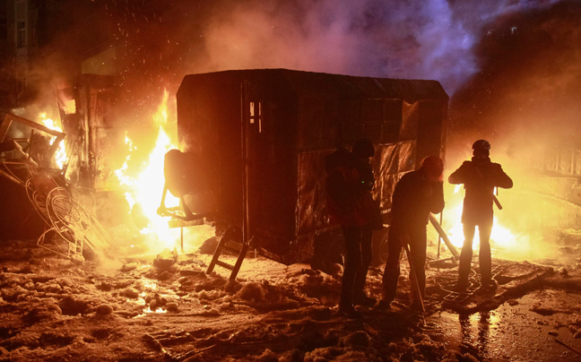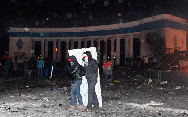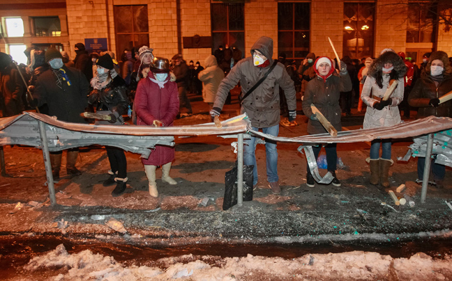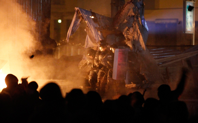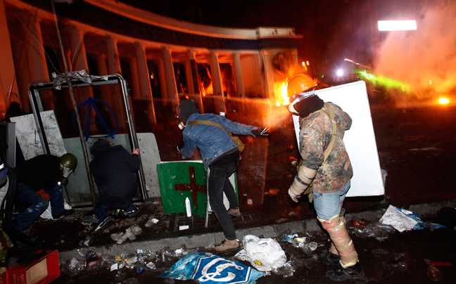 Οι ειδικές δυνάμεις της ουκρανικής αστυνομίας διέλυσαν ένα οδόφραγμα και έναν καταπέλτη που είχαν κατασκευάσει οι διαδηλωτές καθώς οι συγκρούσεις συνεχίσθηκαν στο Κίεβο.