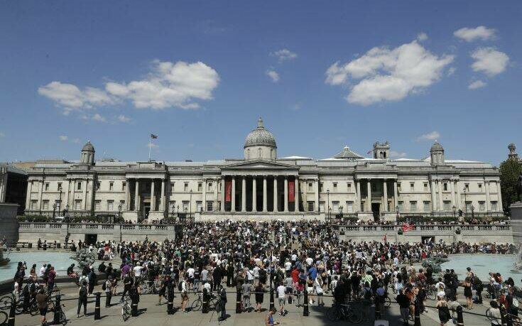 Οι διαδηλωτές γονάτισαν στην Τραφάλγκαρ Σκουέρ του Λονδίνου φωνάζοντας «Καμία δικαιοσύνη, καμία ειρήνη» και στη συνέχεια πραγματοποίησαν πορεία προς το κοινοβούλιο και κατέληξαν έξω από την αμερικανική πρεσβεία.