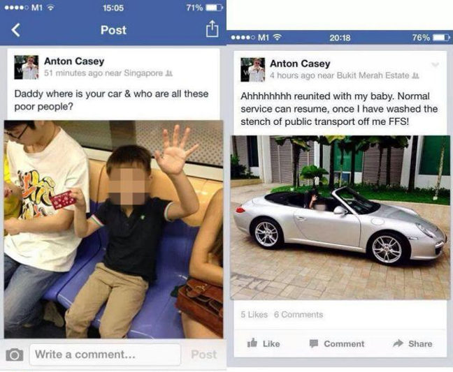 Όλα ξεκίνησαν όταν ο Casey που είναι βασικός μέτοχος της «Crossinvest Asia» δημοσίευσε δυο φωτογραφίες του γιου του: στην πρώτη εμφανιζόταν στο Μετρό υπό τον τίτλο «Μπαμπά, που είναι το αμάξι σου και ποιοι είναι όλοι αυτοί οι φτωχοί άνθρωποι;», ενώ στη δεύτερη φαινόταν ο γιος του σε μια ασημί Πόρσε με τον υπότιτλο, «Ahhhhhhhhh, ξανά με τον γιο μου. Επιτέλους όλα είναι φυσιολογικά, ειδικά τώρα που έδιωξα τη βρωμιά των Δημόσιων Μέσων μετακίνησης από πάνω μου!».