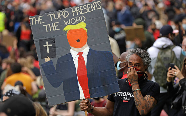 Ο κόσμος φώναζε «Τζορτζ Φλόιντ» και «Black lives matter», ενώ κάποιοι έβριζαν τον πρόεδρο των ΗΠΑ Ντόναλντ Τραμπ και τον πρωθυπουργό της Βρετανίας Μπόρις Τζόνσον.