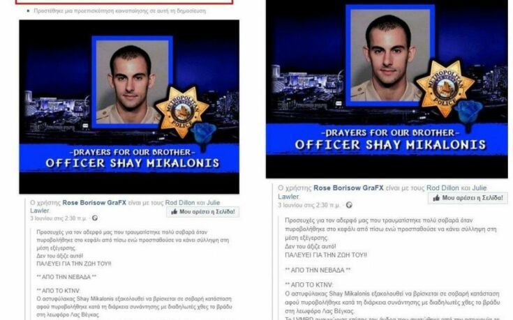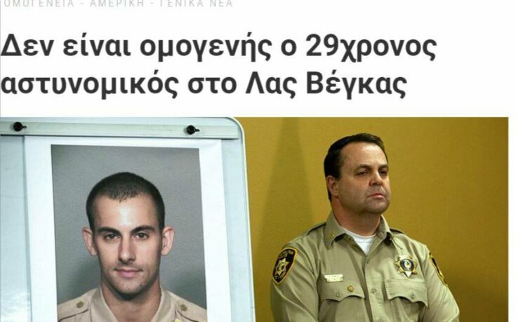 Πηγή των άρθρων που κάνουν λόγο για την ελληνική καταγωγή του αστυνομικού, είναι το κείμενο που αναρτήθηκε στην ειδησεογραφική ιστοσελίδα greekreporter.com, στο οποίο αναφέρεται ως πηγή της είδησης η σελίδα του Facebook “Ahepa District 20“. Όμως το κείμενο που ανέφερε ότι ο 29χρονος αστυνομικός ήταν μέλος της Ελληνοορθόδοξης εκκλησίας του Λας Βέγκας αφαιρέθηκε (φωτογραφία δεξιά).