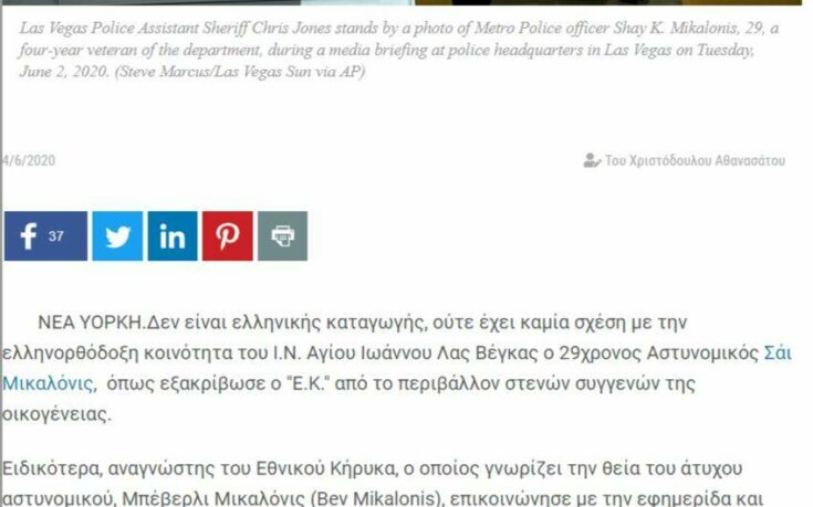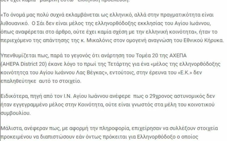 Η εφημερίδα της ομογένειας “Εθνικός Κήρυκας” ήρθε σε επικοινωνία με άτομο από το στενό οικογενειακό περιβάλλον του θύματος, το οποίο επιβεβαίωσε ότι ο αστυνομικός δεν είναι ελληνικής καταγωγής, και δεν έχει καμία σχέση με την ελληνορθόδοξη κοινότητα του Ι.Ν. Αγίου Ιωάννου Λας Βέγκας. Όπως χαρακτηριστικά διαβάζουμε στο άρθρο: