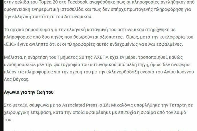 Συμπερασματικά, το περιστατικό του σοβαρού τραυματισμού είναι πραγματικό, αλλά ο 29χρονος αστυνομικός δεν είναι ελληνικής καταγωγής και δεν έχει καμία σχέση με την ελληνορθόδοξη κοινότητα του Λας Βέγκας.