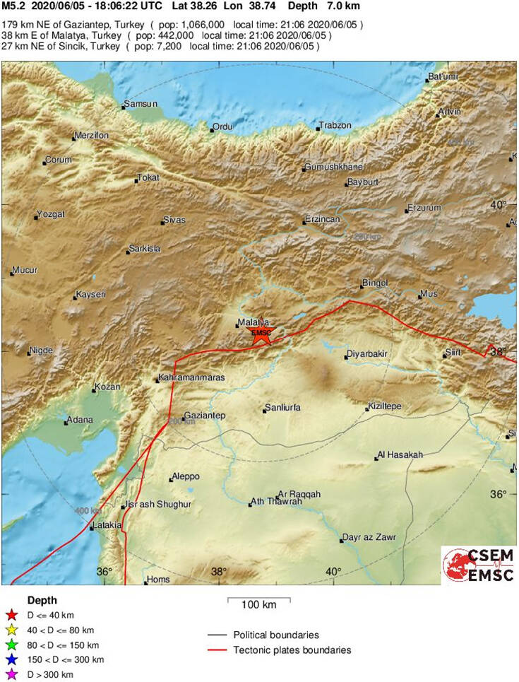 Πιο συγκεκριμένα, σύμφωνα με το Ευρωμεσογειακό ινστιτούτο το επίκεντρο εντοπίζεται 27 χιλιόμετρα νοτιοανατολικά της πόλης Sincik, 38 χιλιόμετρα ανατολικά της Μαλάτια και 179 χιλιόμετρα νοτιοανατολικά της μεγάλης πόλης Γκαζιάντεπ.